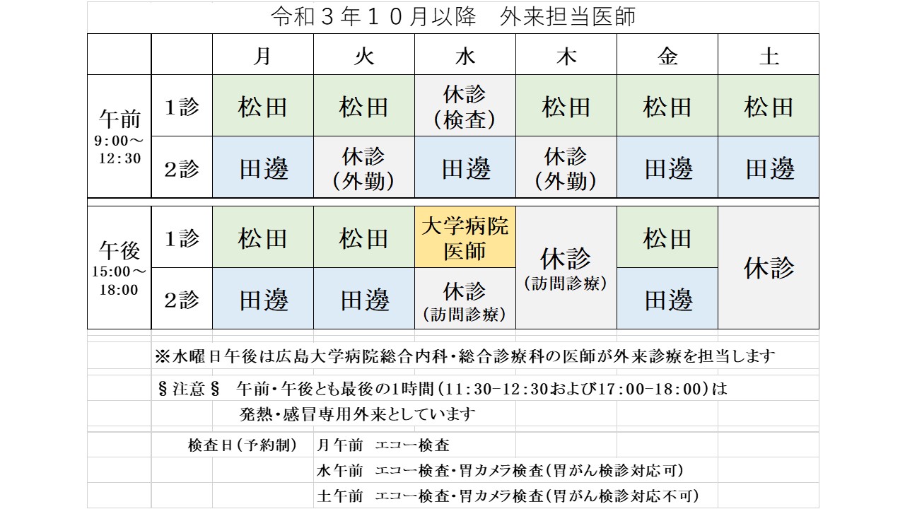 それに伴って医師が3名→2名に減るため、外来体制が令和3年3月までとほぼ同様のスケジュールに戻ることになります。
